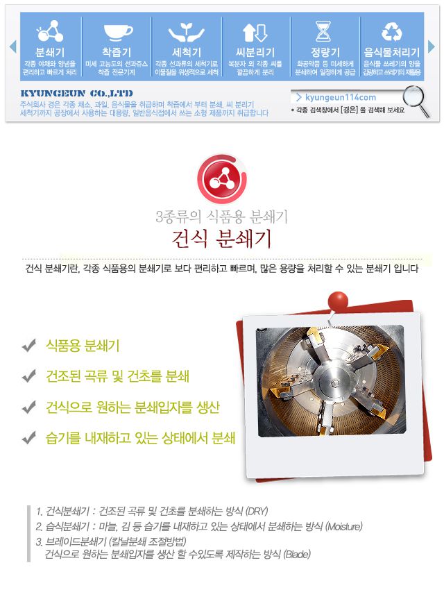 - 습식 분쇄기 : 마늘, 김 등 습기를 내재하고 있는 상태에서 분쇄하는 방식(Moisture)